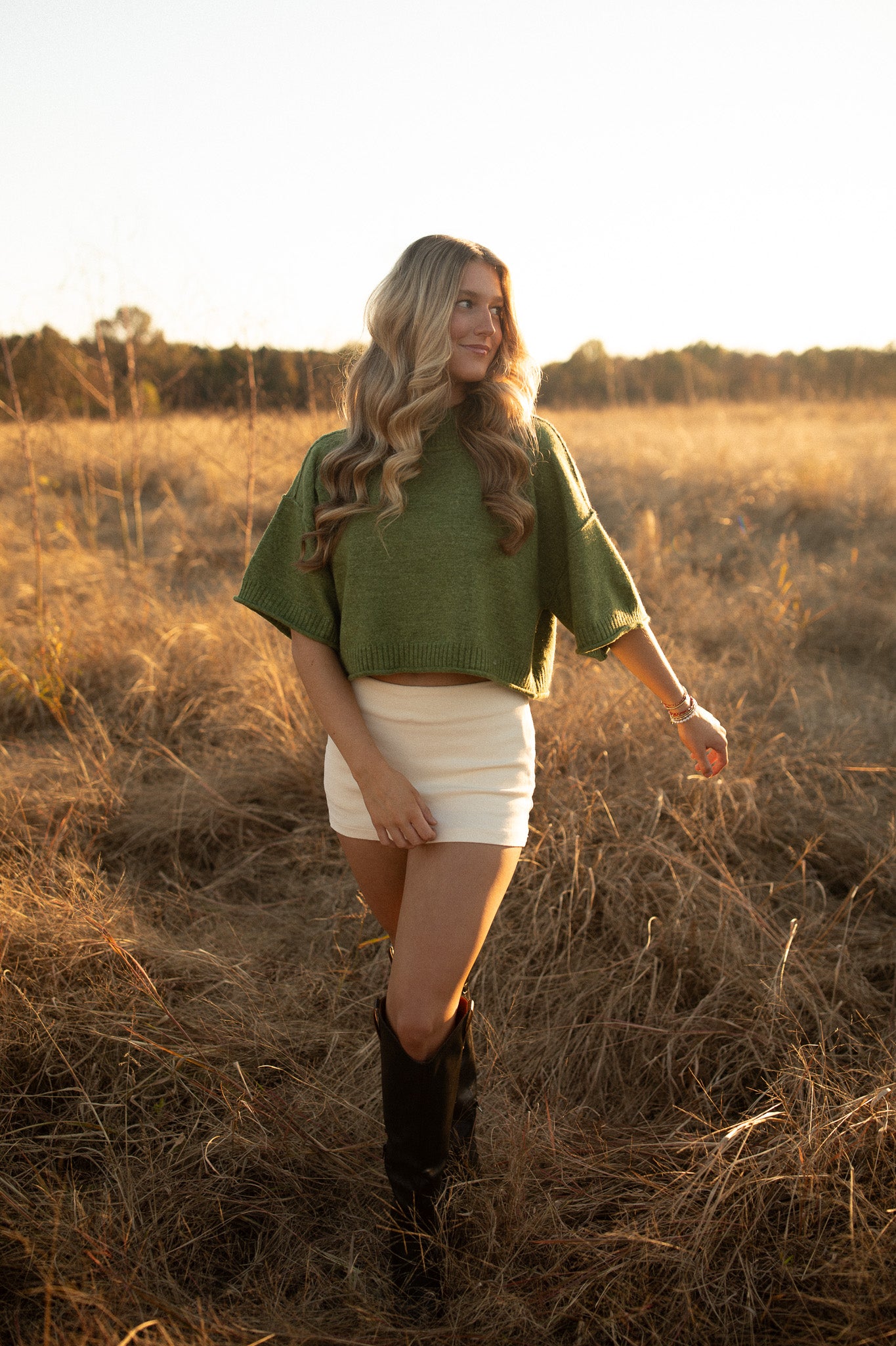 - Marled knit mock neck short sleeve sweater + Ribbed mock neckline + Raw edge seam detail + Wide short sleeves with rubbed cuffs + Semi-cropped bodice + Ribbed neckline, cuffs, and hem + Model is 5' 7.5" 30-25-36 and wears a S