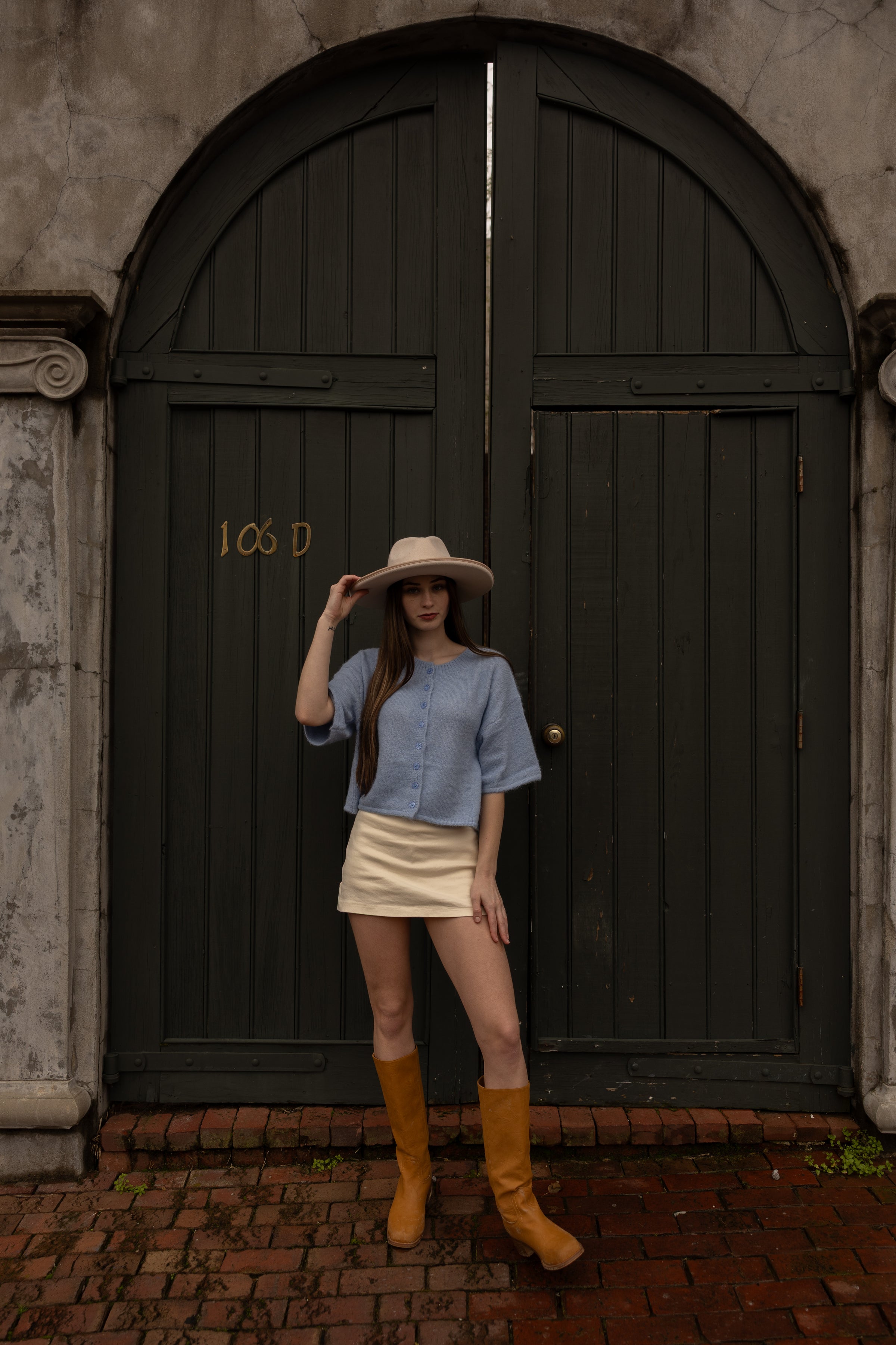 - Soft Brushed Knit Fabric - Crew Neckline with Ribbed Trim - Front Button Closure - Drop Shoulder Short Sleeves - Cropped, Boxy Silhouette - Unlined with Cozy Feel - Lightweight and Layerable - Clean Hemline Finish