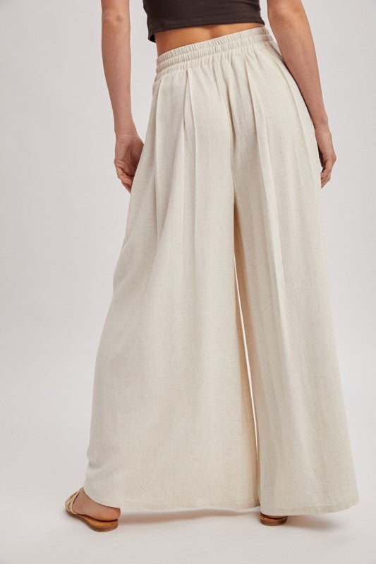 70%RAYON, 30%LINEN These are wide-leg palazzo pants in a muted olive green, black, oatmeal color, crafted from a lightweight, flowing fabric. They feature a comfortable elasticized high waist with a visible drawstring closure and subtle pleating or gathering below the waistband, contributing to their voluminous silhouette.
